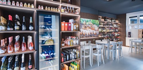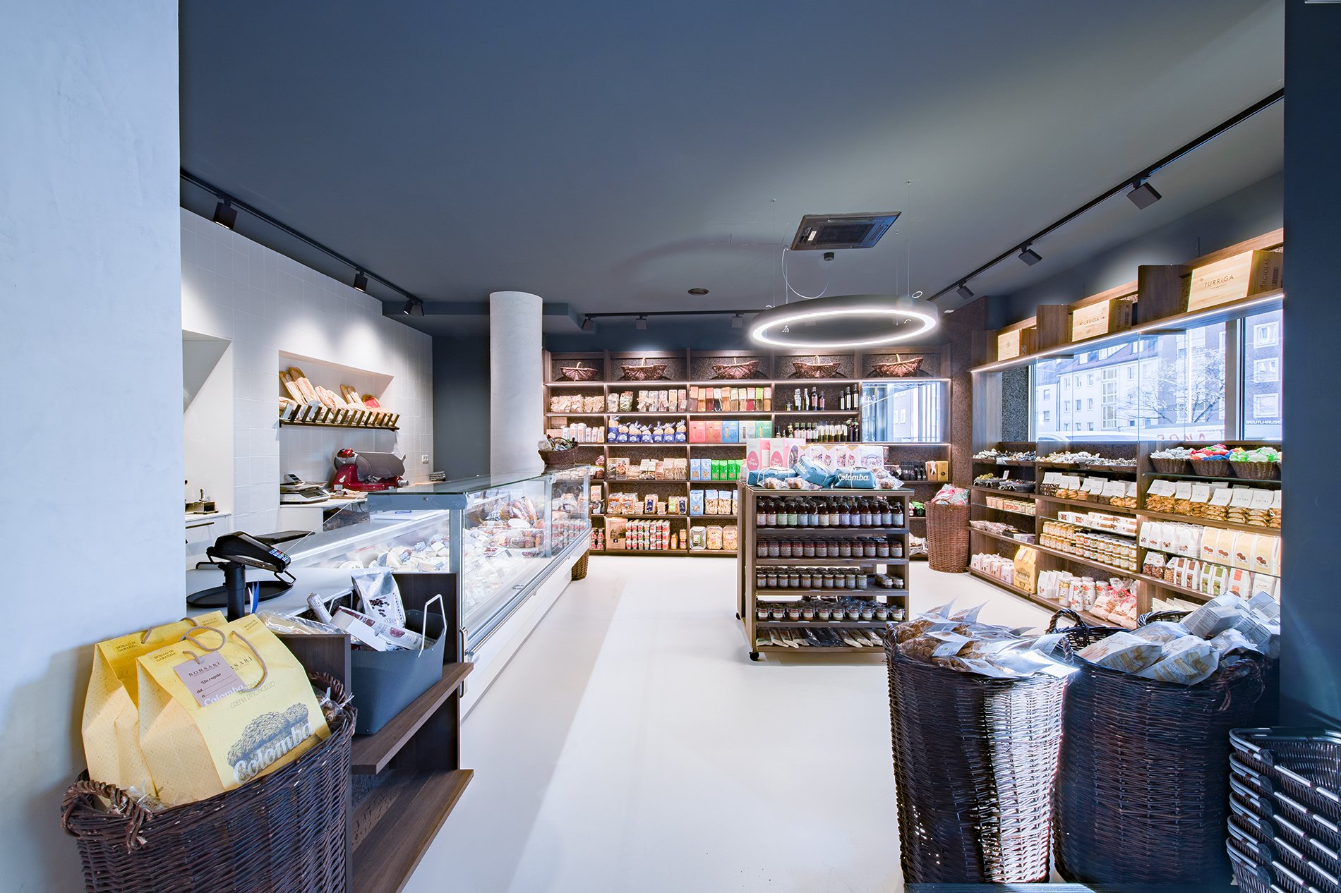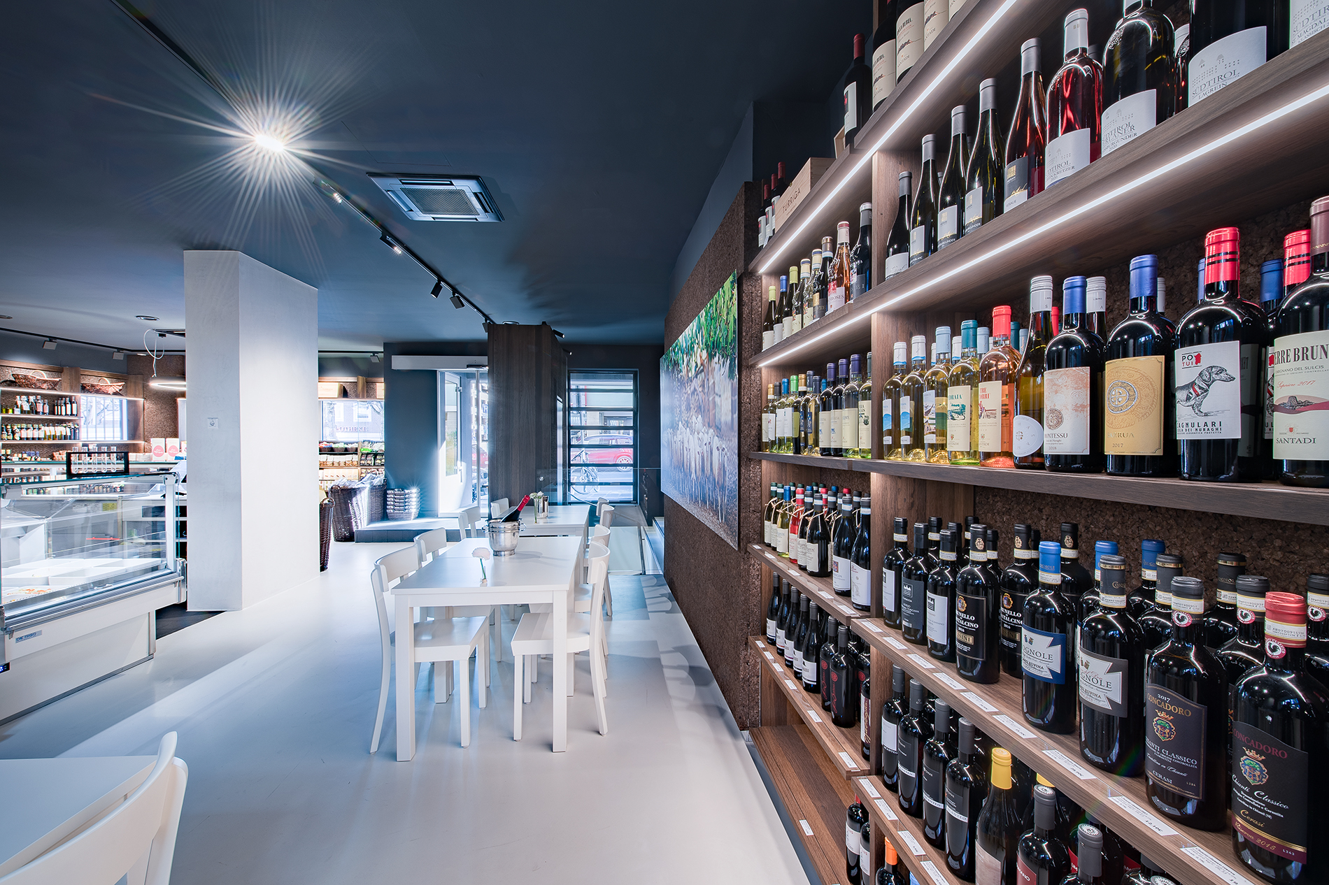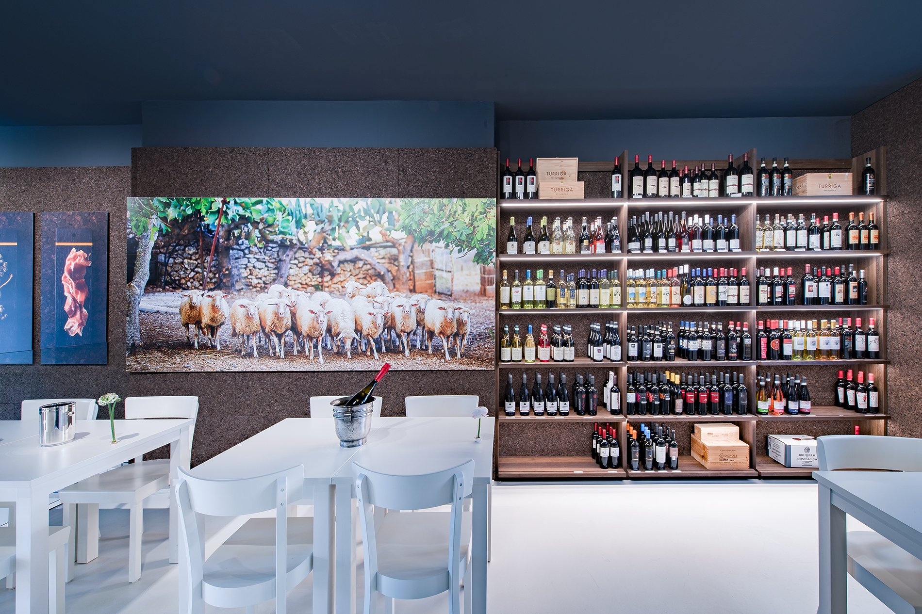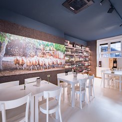 Linkerhand hinter den sechs modern gestalteten Bistrotischen ein Weinregal mit etwas über 100 passenden Weinen. Rechts die Pastaspezialitäten, Olivenöl, Antipasti, Pesto, Oliven, die legendären Sardischen Fladenbrote, fantasievolle Dolce. Auch wer ein schnelles Geschenk mit Niveau sucht, wird hier fündig und fachkundig beraten.