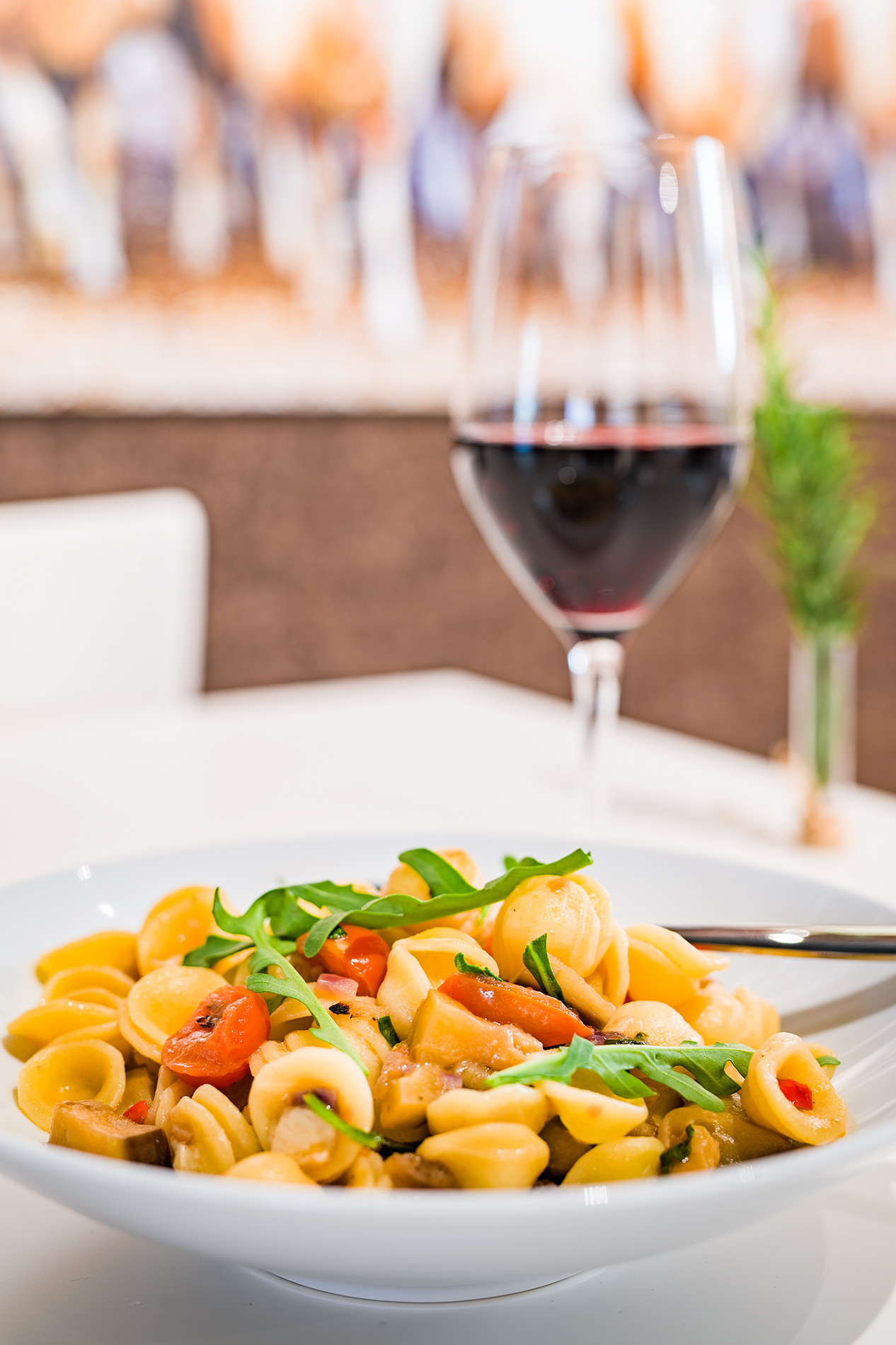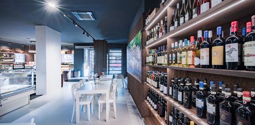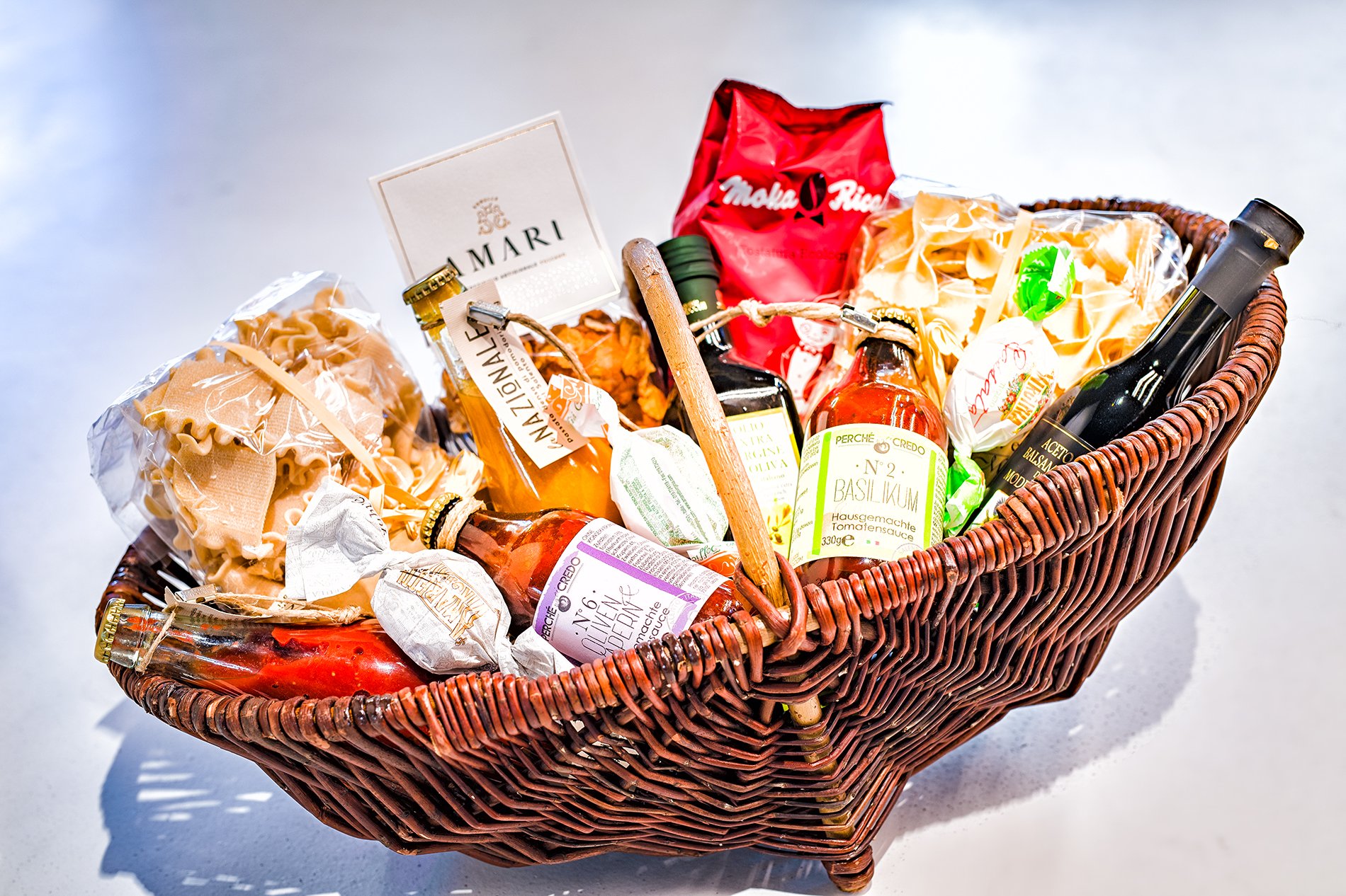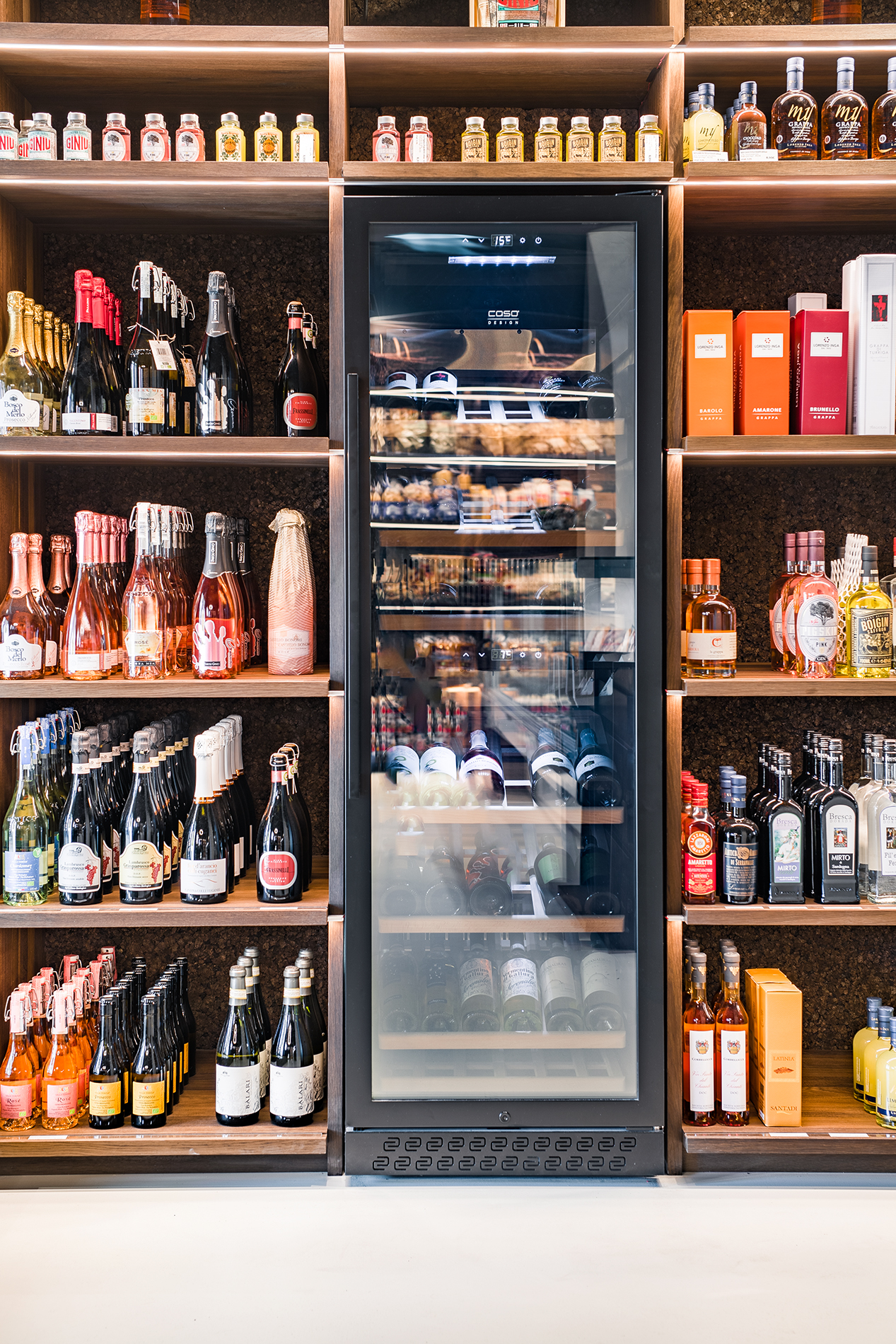 Linkerhand hinter den sechs modern gestalteten Bistrotischen ein Weinregal mit etwas über 100 passenden Weinen. Rechts die Pastaspezialitäten, Olivenöl, Antipasti, Pesto, Oliven, die legendären Sardischen Fladenbrote, fantasievolle Dolce. Auch wer ein schnelles Geschenk mit Niveau sucht, wird hier fündig und fachkundig beraten.