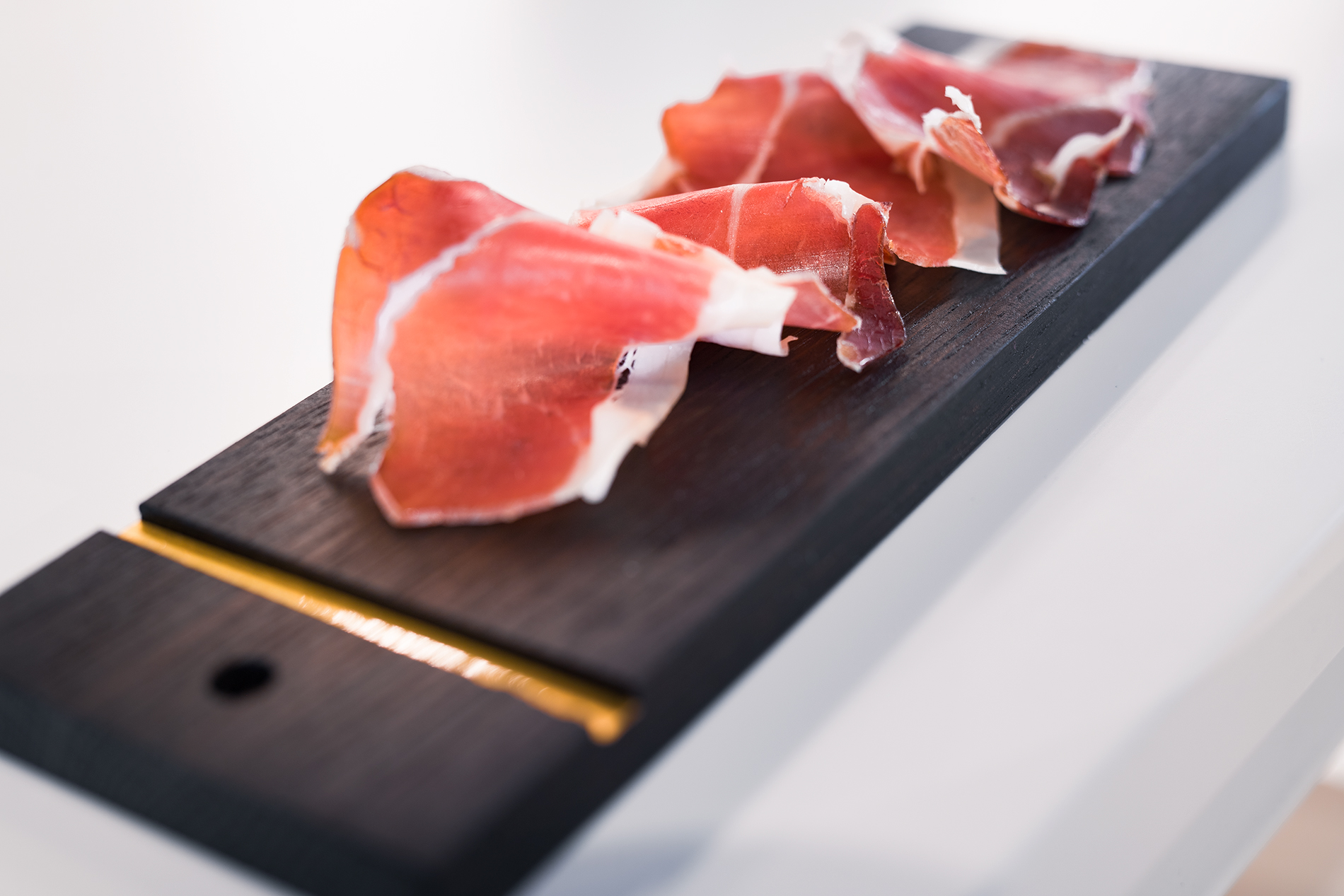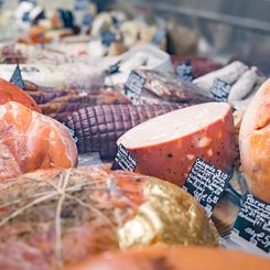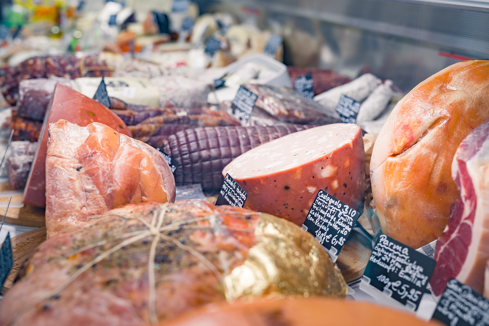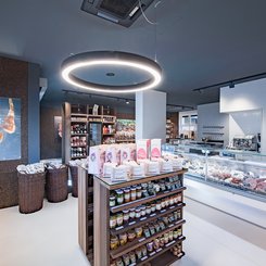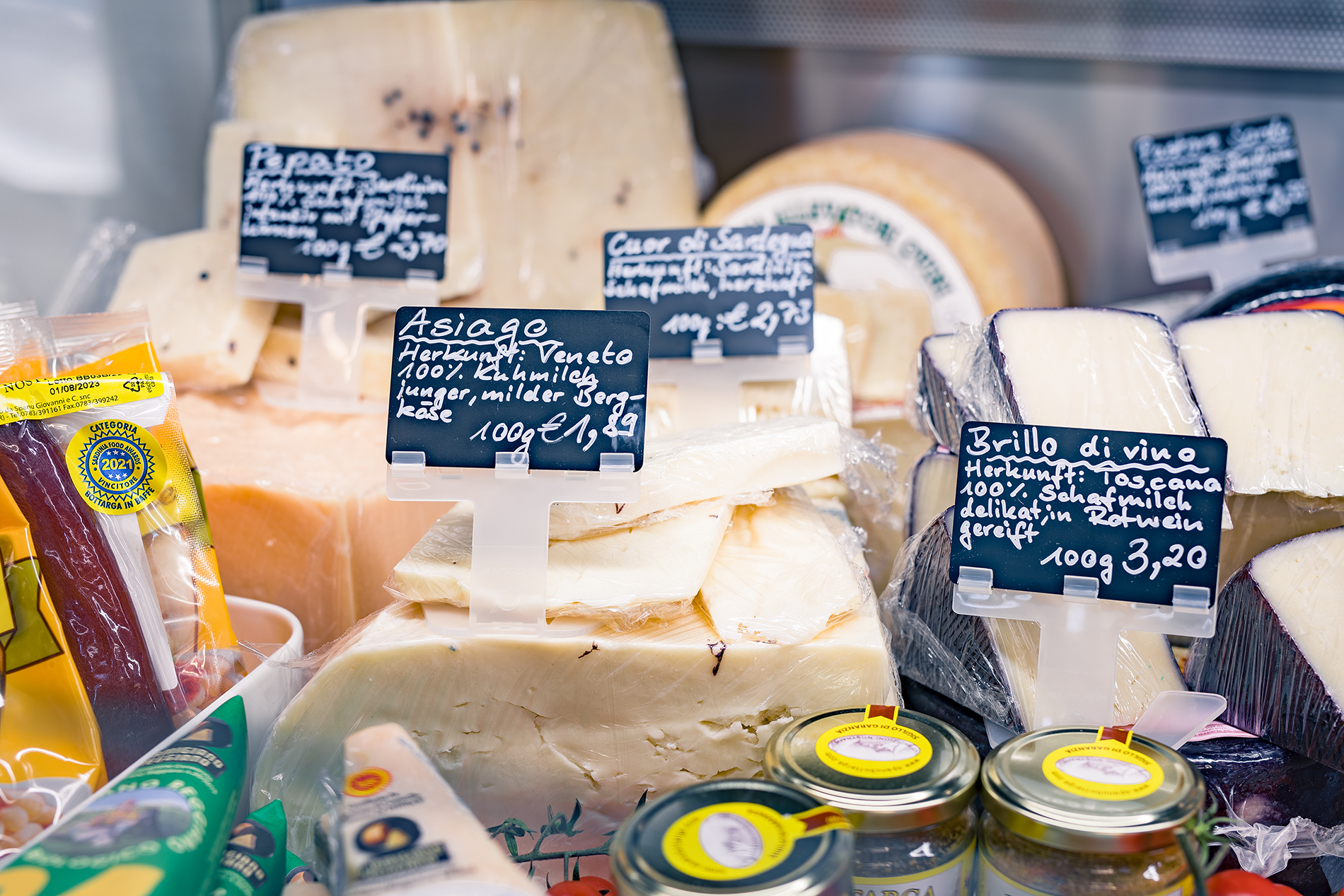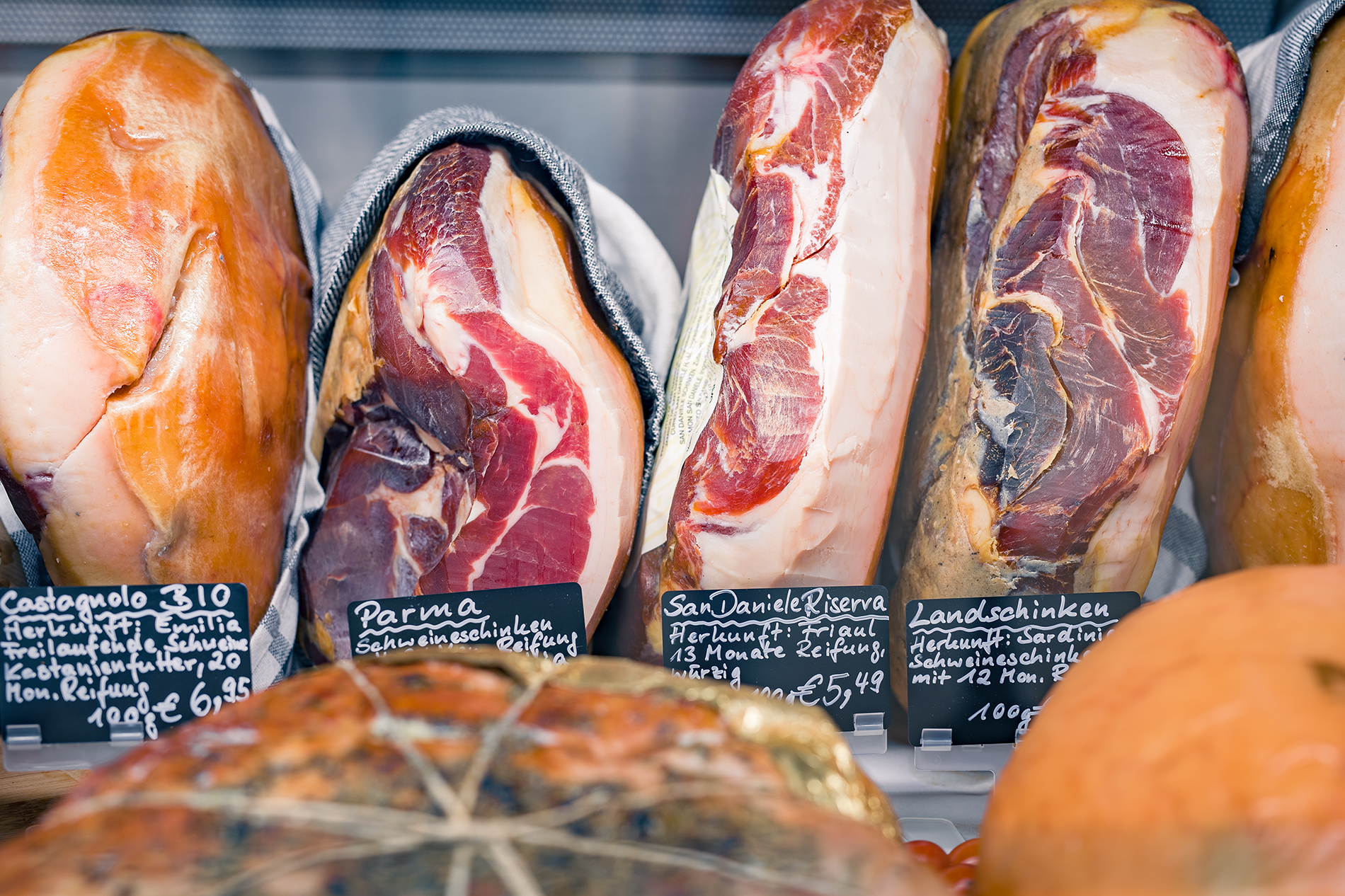 Schon rechts neben dem Eingang grüßen 3 Schinkenkeulen den Gast wie im Schlaraffenland. Im Zentrum präsentiert die mehrere Meter lange Frischetheke eine eindrucksvolle Vielfalt feinster italienischer Schinken-, Wurst-, und Käsespezialitäten. Einige gibt es in Deutschland exklusiv bei Il Nuraghe, wie z.B. den berühmten Castagnoloschinken (20 Monate gereift von Schweinen, unter Maronibäumen leben) oder die Sardischen Schafskäse von Boi.