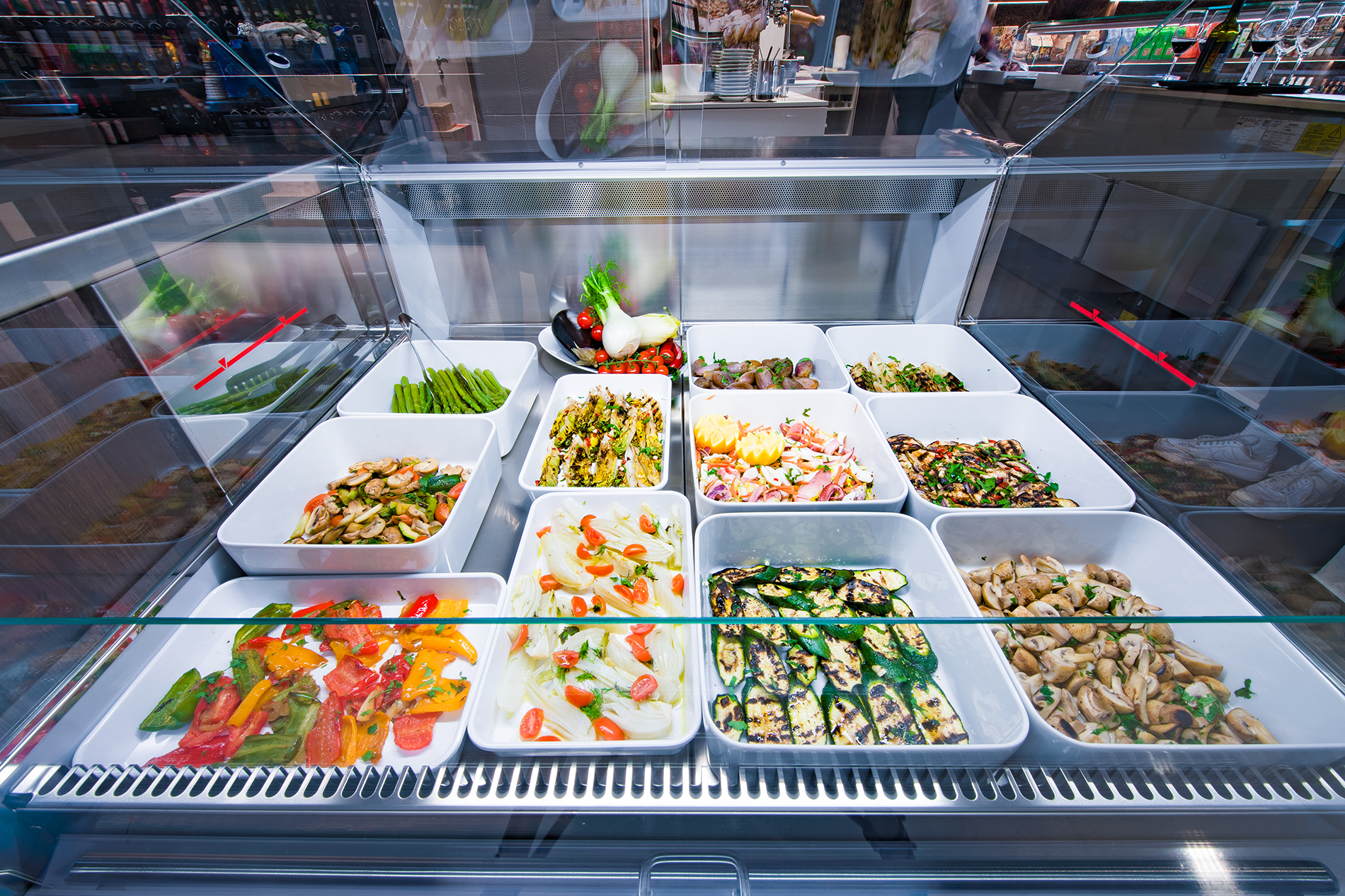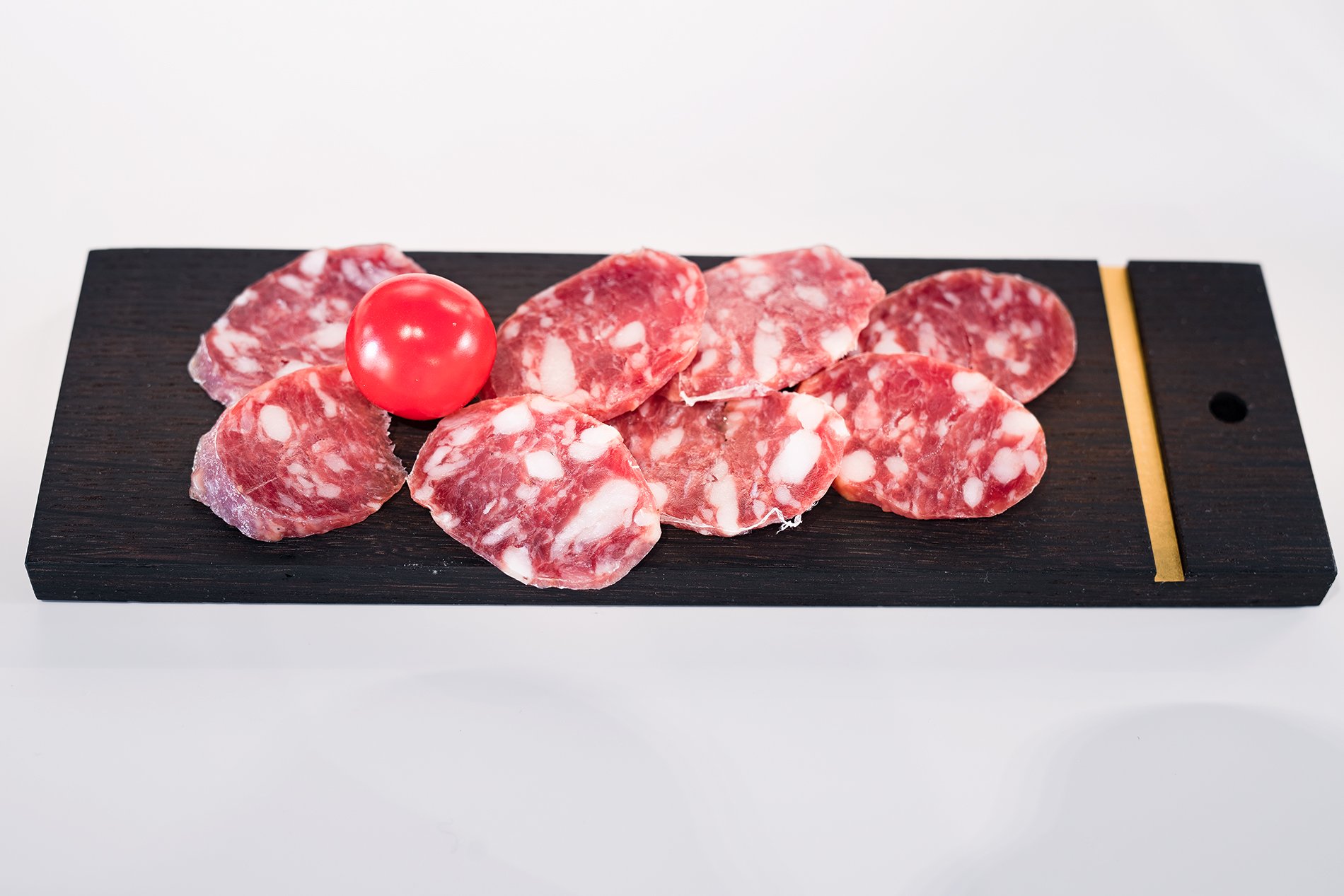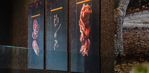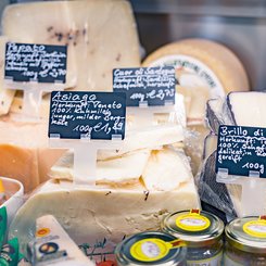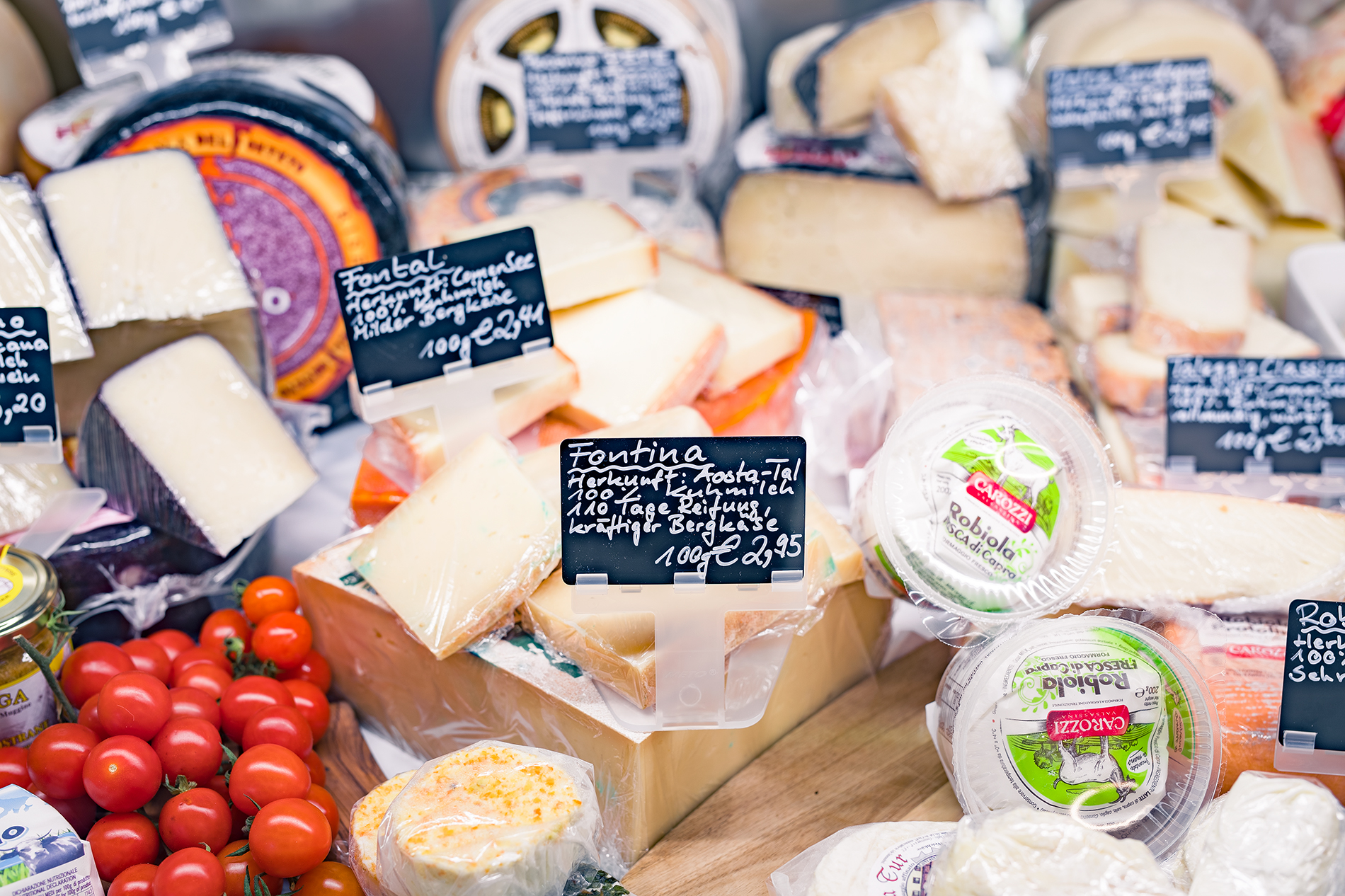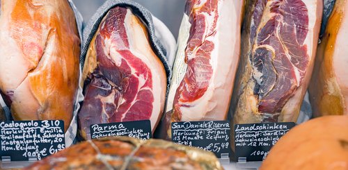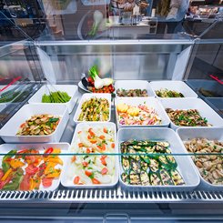 Schon rechts neben dem Eingang grüßen 3 Schinkenkeulen den Gast wie im Schlaraffenland. Im Zentrum präsentiert die mehrere Meter lange Frischetheke eine eindrucksvolle Vielfalt feinster italienischer Schinken-, Wurst-, und Käsespezialitäten. Einige gibt es in Deutschland exklusiv bei Il Nuraghe, wie z.B. den berühmten Castagnoloschinken (20 Monate gereift von Schweinen, unter Maronibäumen leben) oder die Sardischen Schafskäse von Boi.